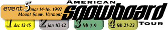 Event Highlights Kosglow's domination continues. She only won every event she entered on this year's tour. Our congrats go out to Lisa and men's champ Jeremy Jones who was a first time winner on the tour this year. Here's the scoop: Kosglow Sweeps, Jones Charges in North American Finals Giant Slalom Originally planned were two halfpipes. Have a look at how they'll be run now. AST Halfpipe Finals Restructured. The old news from Friday goes like this. Bad Weather Cancels North American Championship Giant Slalom