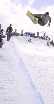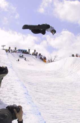 When the dudes finally took to the pipe, it looked like they really just wanted to get it over with. Three or four days of qualifying in the rain had put the zap to ?em. But still, they ripped. The official tally goes, Simmen first, Hoffman second and Franck third. Hoffman doesn?t even go upside down, but somehow edged out Daniel for the number two spot. Daniel was riding really strong after his dizzying slam at the Olympics. He seemed unfazed by getting the shaft?sevens, nines, and amplitude for real must be satisfaction enough.