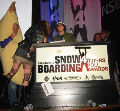 It was the Kevin and Tara show once again at the 4th TransWorld SNOWboarding Rider’s Poll Awards. And despite a near riot on stage by the Grenade posse (who else?), dancing Elvis’s, a packed crowd, way tighter security, a set by Social Distortion, and a huge banana, this year’s event held at the House Of Blues in Las Vegas lived up to its annual billing as one of the premier shows to honor pro snowboarders.