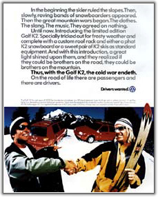 AUBURN HILLS, Mich.-- In a move that could defrost the "cold war" between snowboarders and skiers -- at least get them to a snowy summit -- Volkswagen is introducing a special alpine version of its Golf model, complete with either skis or a snowboard as standard equipment. Volkswagen calls this limited edition model the Golf K2, a car that incorporates the name of the famous U.S. ski manufacturer and gives customers a choice of K2 skis or a K2 snowboard. It also comes equipped with a custom roof rack system designed specifically for Volkswagen. The Golf K2 is a special winter version of Volkswagen's popular five-door hatchback that has been Europe's top seller for nearly two decades. Special styling cues set it apart from other Golfs. Available in Tornado Red, Candy White and Black, the Golf K2 adds special "Siesta" style wheel covers, a roof-mounted whip antenna, front fog lights and special K2 badging. What makes this partnership such a natural fit is that Volkswagen's and K2's target audience share nearly the same demographics, mindset and attitude," said Steve Keyes, Volkswagen's project manager for special models. "As a matter of fact, skiing and snowboarding are at the top of the list of activities for Volkswagen buyers." Keyes said Volkswagen will use print and TV advertising to promote the Golf K2 during the fall and winter, satirizing what has always been an uneasy on-slope relationship between snowboarders and skiers. "They don't agree on anything: music, clothes ... even their slang is different. And yet they are forced to share the same slopes," said Keyes. "We hope that by offering the Golf K2 with either a snowboard or skis, we can show both groups they can live in harmony." Inside, the Golf K2 also distinguishes itself with a special limited- edition "Spirit" cloth interior, custom carpet floor mats, and sport instrumentation gauges with silver faces. Special cold weather features include heated front seats and heated windshield washer nozzles. Power side mirrors include automatic defog. All-season tires complete the package. Audio entertainment is also standard on the Golf K2 with a premium, eight- speaker cassette AM/FM radio. Skiers who decide on the Golf K2 will get a pair of K2 El Camino skis from K2's New School Series -- a new generation of ski designed for a highly energetic, athletically radical style of skiing. With its hourglass design, the K2 El Camino is an all-mountain, free-carving ski for high speeds on hardpack and off-piste. Snowboarders catch a ride on one of K2's most popular professional boards, the K2 Juju with Clicker BLT bindings. The K2 Juju uses a double glass cap, vertical lamination, metallic top sheet, and an ultra light wood core with the shortest tip/tail in the K2 line. Perfect for freestyle riders, the Juju offers more predictable take-offs and landings and carves a smooth and solid edge. The MSRP for the Golf K2 is $14,275. A quintessential world car, the Volkswagen Golf's appeal goes well beyond its renowned versatility: it's also a lot of fun to drive. It is powered by a newly refined 2.0 liter four- cylinder, overhead cam engine that produces 115 horsepower and 122 ft. lbs. of torque for responsiveness across a wide rpm band. Precise handling you would expect in a car bred for the autobahn comes by way of power-assisted rack-and-pinion steering and a four-wheel independent suspension system that employs Volkswagen's unique track-correcting bushings -- a feature designed to minimize unwanted steering effects from the rear wheels during cornering. Other notable features include dual airbags, power central locking and an anti-theft alarm system. The Volkswagen Golf K2 is on sale now.