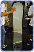 Silence Snowboards, one of the few major snowboard companies to show at the ASR fall show had a super top-secret graphite model in the booth. It was light and springy. "The board is light, but that's not why we did it," says Trent Smith, president of Silence. "This is really just a prototype for the composite boards that we're working on for next year. But flex this thing and feel it." The board has a nice snappy flex. And the construction looks pretty smooth. That can be a problem when using composites, according to Smith. "People think using graphite is easy, but it's pretty difficult to get everything right. But we've figured it out." |