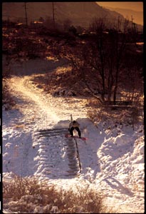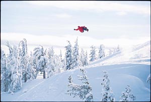 Couple of years now, Andrew been formin' a new style of ski-boardin'. I calls it controlled insanity. He'll just goes fer it. Everybody there, 'cludin' myself, thinkin', "That boy gonna break 'is god-dam neck off." An damn straight we let 'em do it, couldn't stop 'em anyhow. We like seen some carnage every once in a while, but he ain't helpin' us out there none. He gets a look in his eye, an' it stuns you from tryin' ta stop 'em. Stops ya dead in yer tracks, like a mule deer when he hears you cock yer 30/06. Anyhow, that half-cocked look he gets me a thinkin' how long this boy's been crazy as a loon. Jumpin' offer 80-footers with fiddles and all, it's certifiable.