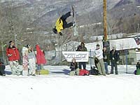 Chris Runge was ruling all day. Photo: Brooke Geery. | Even though the event didn't carry a huge cash purse, the glory of being televised or even judges, its ghetto fabulous concept still attracted most of the east's finest. Indeed, Brooklyn, Vermont was a virtual who's who of East Coast snowboarding. By listening to Joel Muzzy announce, one could learn that Ross Powers, Adam Petraska, Rahm Klampert, Danny Kass, Ali Berntstein, Jaime Macleod and many others were in the mix. Although it was rumored that members of the elite Forum eight would be in attendance, the only rider on a Forum board was Zach Leach. Trevor Andrew was also rumored to show up, but instead there were four or so of his clones. Since some of them, such as Midwesterner Chris Runge proved to be pretty good, it's okay to overlook their apparent lack of individual style. If snowboarding wasn't your thing, DJ's provided a soundtrack of beats, which were only slightly hindered when one of the speakers caught on fire. There were also models in skimpy clothing falling all over themselves trying to hike up the pipe.
