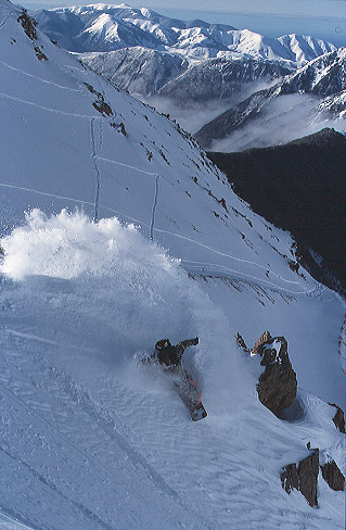 Steve Scott blowing through the southern hemisphere. | After a good night's sleep we headed off to Caldron. For a small hill this place really used their space well. Besides the four, yes four half tubes and a full park they also had some really easy hikes. Be careful though if you don�t watch where you're going, you will end up in the ocean before you hit the resort again. That night we celebrated our first day in N.Z. with a stop at the local pub for a couple of beers. This would turn into a tradition that would follow us through the whole trip, and sometimes through to the following morning. The next day we were off to Treble Cone. The weather was a little socked in, but up top was blue bird. After getting a couple tee bars in the butt we headed above the clouds to a great day and another great view. The upper mountain was still fresh pow and we got some fresh turns. When we came in for lunch I realized that they have sushi in the lodge: sushi. And it's good, too. Now don�t get me wrong I still ate a meatpie everyday, who can turn down steak and cheese in a flaky pastry crust? Not I. But I love sushi. After a great dinner and a couple of drinks we headed to bed early. For tomorrow was heli-boarding. The guide s for Harris Mt. Heli.�s met us at our hotel and we followed them to their heli pad in the North Buchanan Mts. They told us it had not snowed in a couple of days, but they thought the snow would still be good. They were wrong, the snow was great. Damn near bottomless. Oh, did I mention there wasn�t a cloud in the sky? Once again we were surrounded by the most amazing views in all directions. After a half a run we decided to upgrade to a seven run day, which was about $80 extra. Halfway through the third run we stopped for lunch. No meat pies, but they did have the next thing, sushi. The guides had flown in an elaborate spread soup to nuts, seriously they had both soup and nuts. We finished off our last three and a half runs on a full stomach and headed back to the car grinning from ear to ear. Let me tell you something after you've heli boarded you never want to ride a lift again. After a day like that we needed a day off. We took our time and checked out the sites on the way to Queenstown. I highly recommend Puzzle World in Wanaka. They have a room built on an angle that will make you sick to your stomach in a matter of minutes. It's probably a good idea to hold off on the pub till after your visit. Upon our arrival to our hotel we decided to drop off our bags and meet back up. Now where would be a good place to meet up? Hmmm, how about the bar? Okay, Queenstown has an amazing nightlife with great dining, casinos and pubs. Some of the dance clubs don't close till 5 a.m. Needless to say it would be the beginning of a long couple of days that would leave us usually "groggy" the next morning. Bright eyed and bushy tailed we were off the next morning to The Remarkables. They were just that, remarkable. If I was going to buy a pass anywhere we went this would probably be it. We hit it on a beautiful spring day, the sun was shining and the snow as ni ce and slushy just the way it should be when you can�t ride pow. They had a pretty short and sweet park with a couple of tabletops and a few rails. The snow wasn�t really "hiking" conditions but it looked like there was some really good ones had the conditions been right. And guess what else they had ... you guessed it, more views. We shredded the day away and topped if off with some of the finest cuisine Queenstown had to offer. Another tough day under the belt. We deiced to spend our last day shredding at Cornet Peak. Cornet was a fun hill it also had a small park with a couple jumps and a few rails. Me and my homies spent most of the day at the pipes. They had two that were maintained and one even had a fun box on it. After a day of on hill shenanigans we headed back down for our last night in Queenstown. This would prove to be an eventful one. Lets just say we lived up to the ugly American stereotype pretty well that night. I�ll leave it at that.